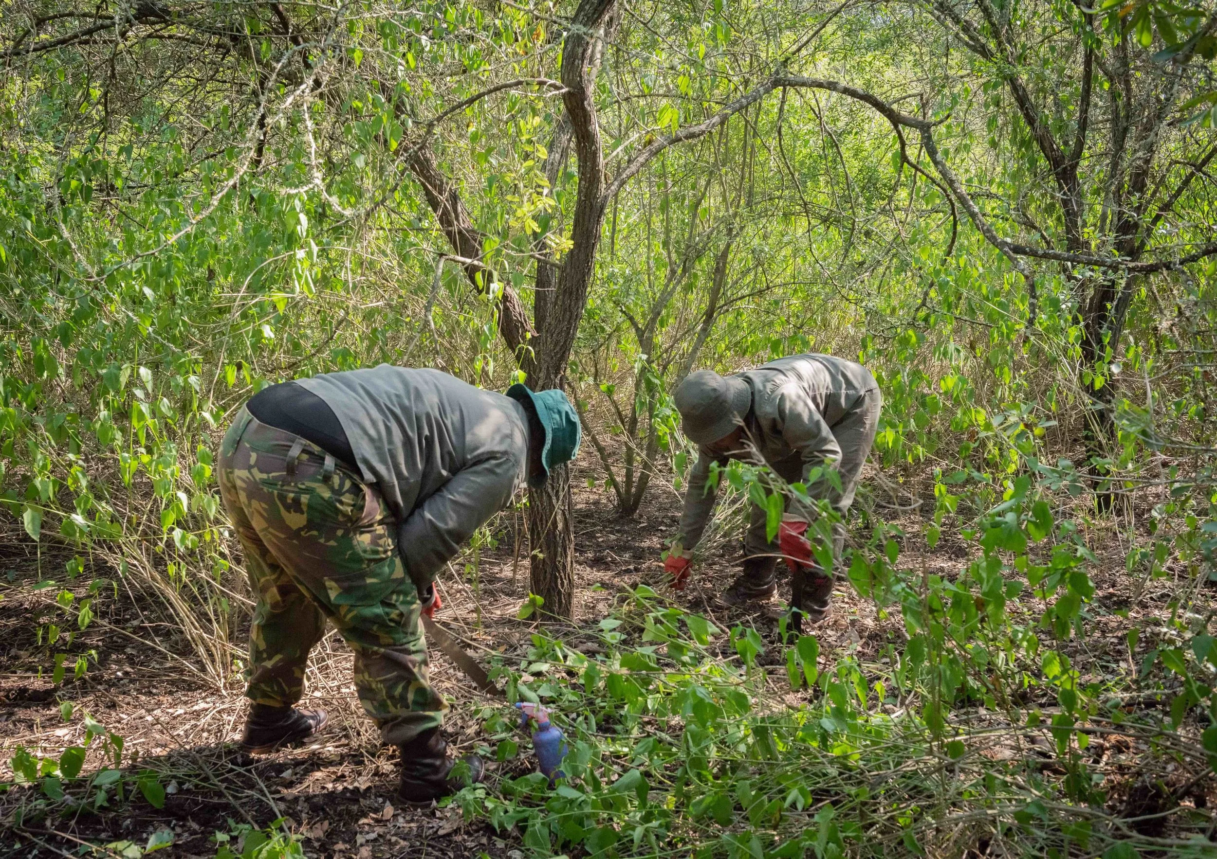 The Green Mambas hard at work restoring the Ukuwela Nature Reserve, removing invasive alien plants manually. Photograph by Wild Tomorrow Fund Ambassador, Barbara Engel.