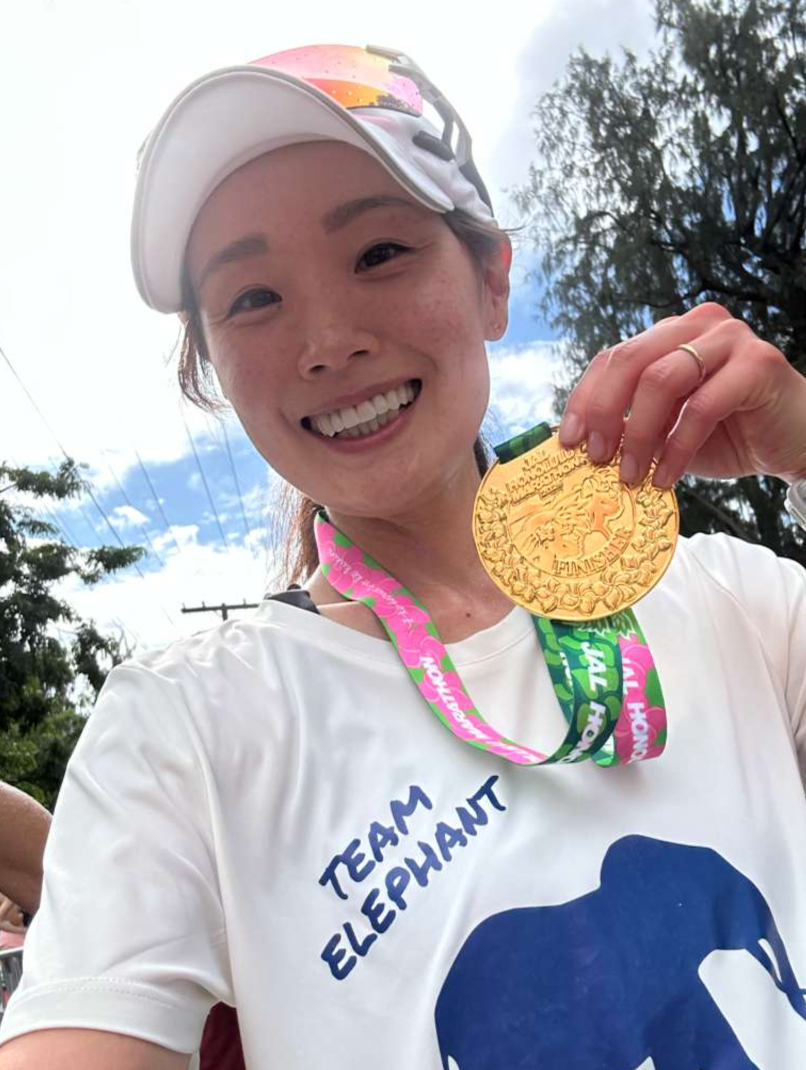 Michi with her medal after she volunteered to run Honolulu for Wild Tomorrow in 2025.